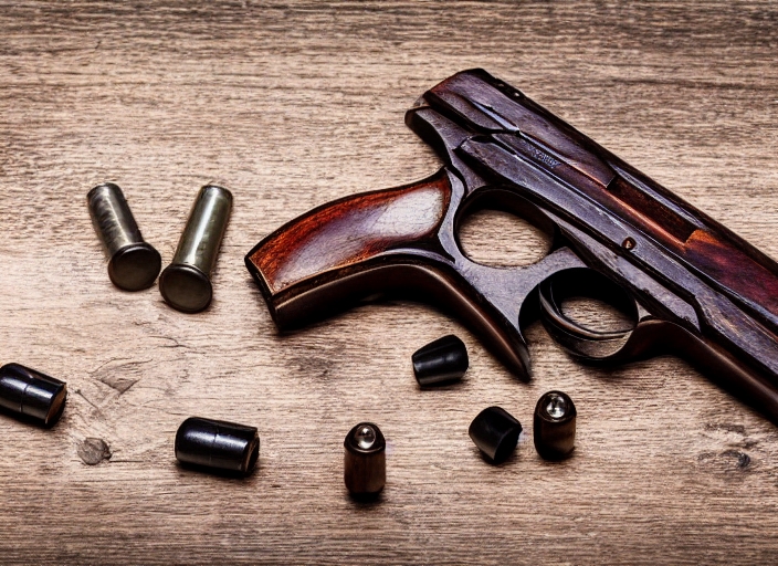 Historic Luger P08 Parabellum handgun and shiny 9 mm bullets on wooden vintage background