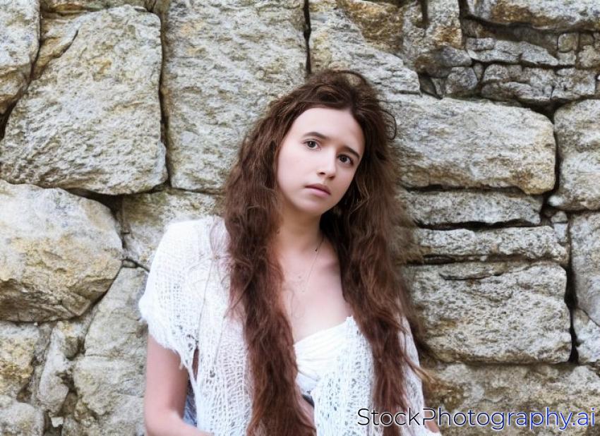 Longhaired hippy-looking young lady in jeans shorts, knitted shawl and white blouse stands near stone wall in old town looking away