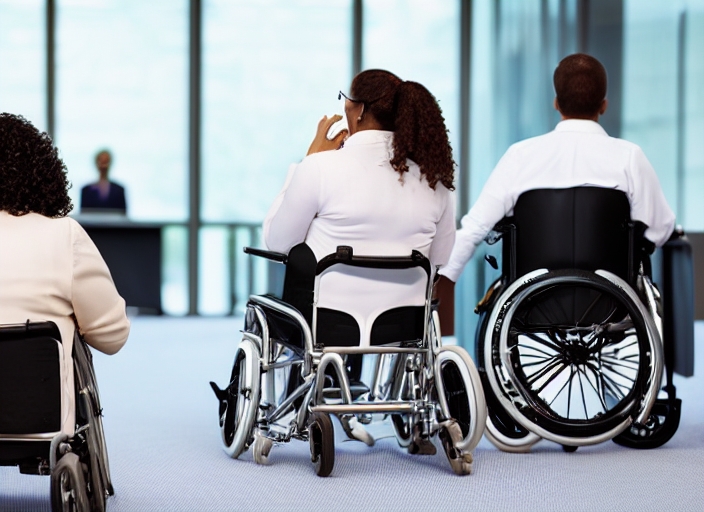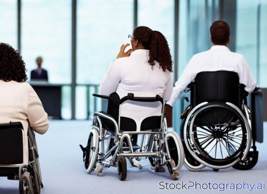 Rear view of nrecognizable woman on wheelchair participating in business conference talk. Business and entrepreneurship symposium. Speaker giving talk at business meeting. Audience in conference hall.