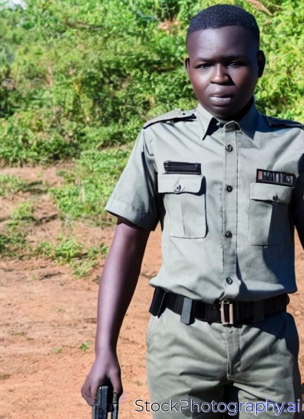Serious African young man with short black hair in uniform holding handgun - Isolated