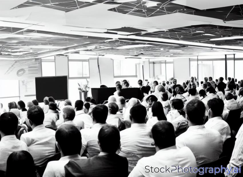 Speaker giving a talk at conference meeting business event. Audience at the conference hall. Business and Entrepreneurship concept. Black and white image.