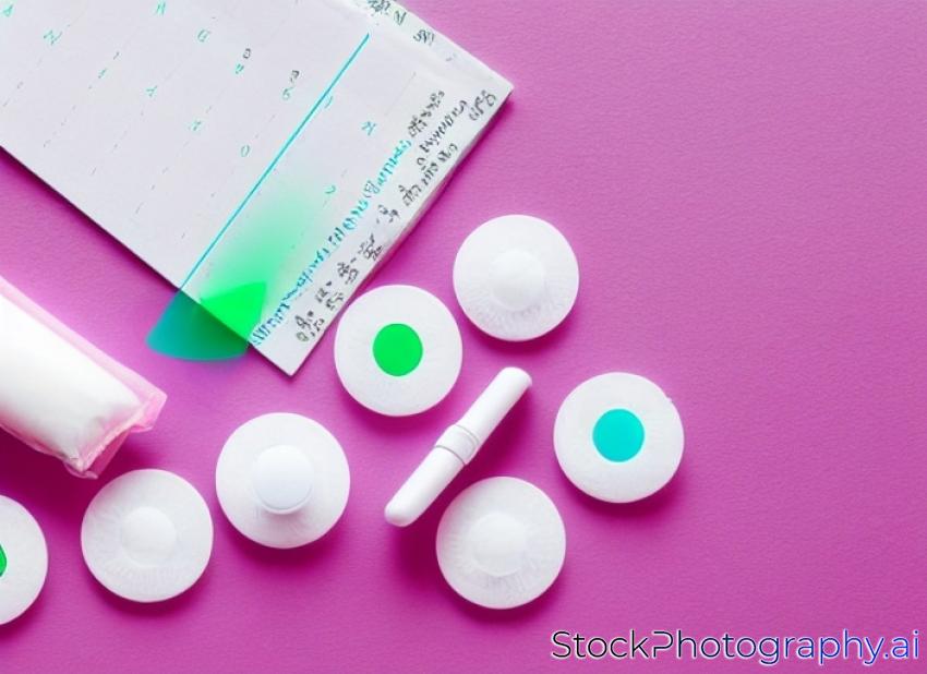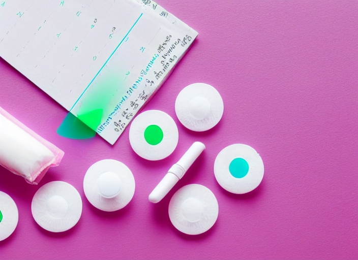 Tampon, feminine, sanitary pads for critical days, feminine calendar, pain pills during menstruation on a pink background. Tracking the menstrual cycle and ovulation.