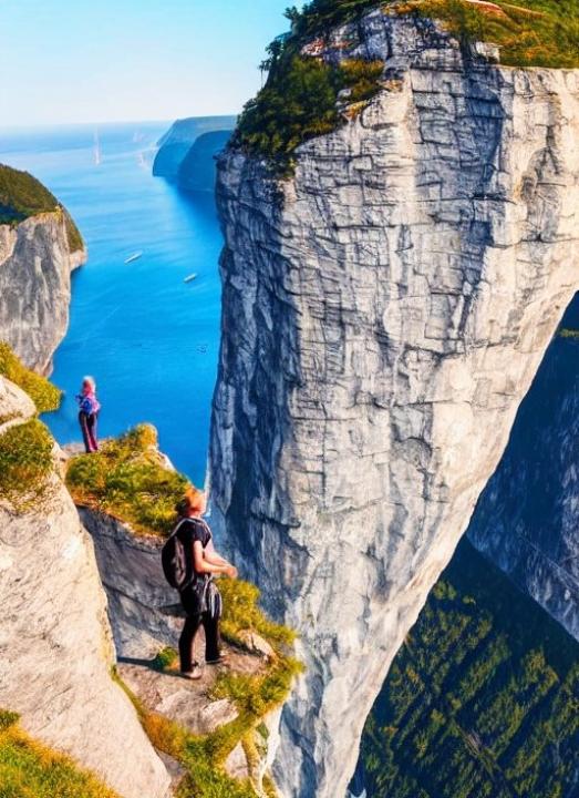 adventure attraction brave cliff cloudy dangerous destination edge famous fjord fog foggy forsand hike hiking landscape lysefjord lysefjorden man mist mountains nature norge norway norwegian popular preachers preikestolen prekestolen pulpit rock rocks route scandinavia scandinavian scenery scenic sea standing tourism tourist touristic trail travel trekking turquoise vertical viewpoint water weather woman-