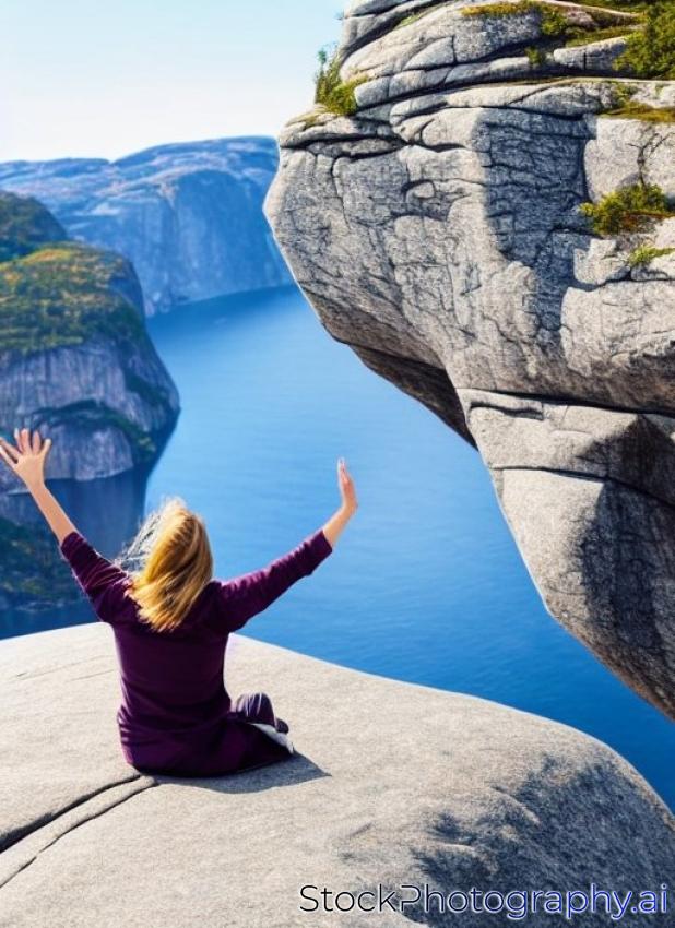 adult arms attraction cliff extreme female fjord girl greeting happy hiker hiking hill holidays journey landmark landscape lysefjorden mountain nature norway norwegian outspread peak people person plateau preikestolen raised rock scandinavia scenery scenic sitting summer summit top tour tourism tourist travel traveler trip vacation vertical wave welcoming woman young-