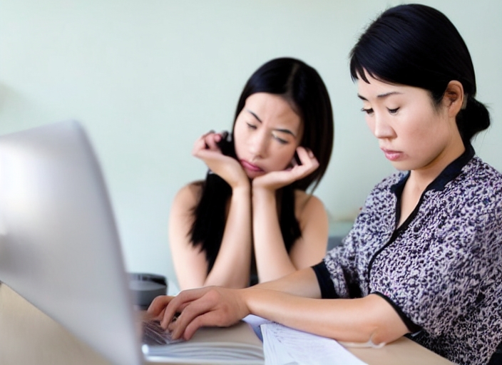 Women work at home until being very tired. Asian women work at home during the Covid-19 epidemic.