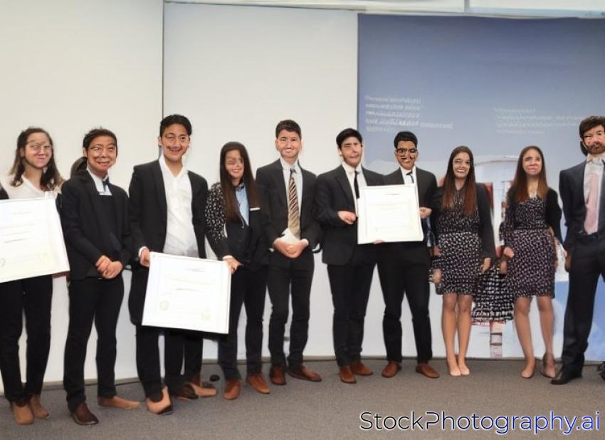 Young business team receiving award at best business project competition event.