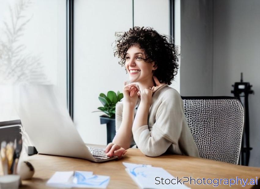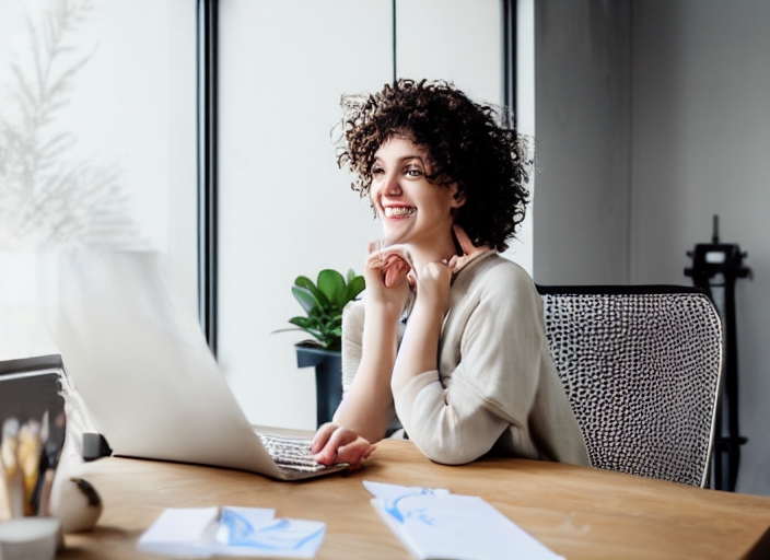 Young cheerful woman with dark curly hair sitting at the table using laptop and drawing sketches happily looking in camera in modern cozy workshop with big windows