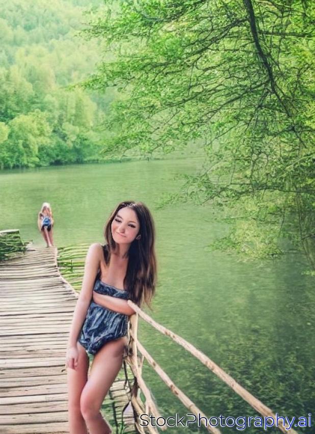 Young sexy brunette girl in nature and reeds near a river and trees.Woman enjoys evening at the lake on a wooden walkway