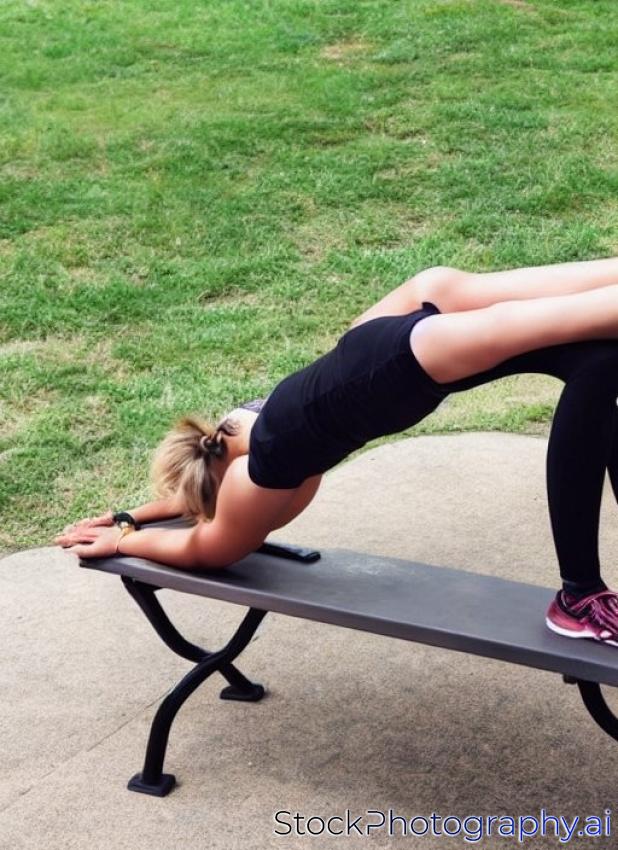 Young woman performing tricep dips on a bench.