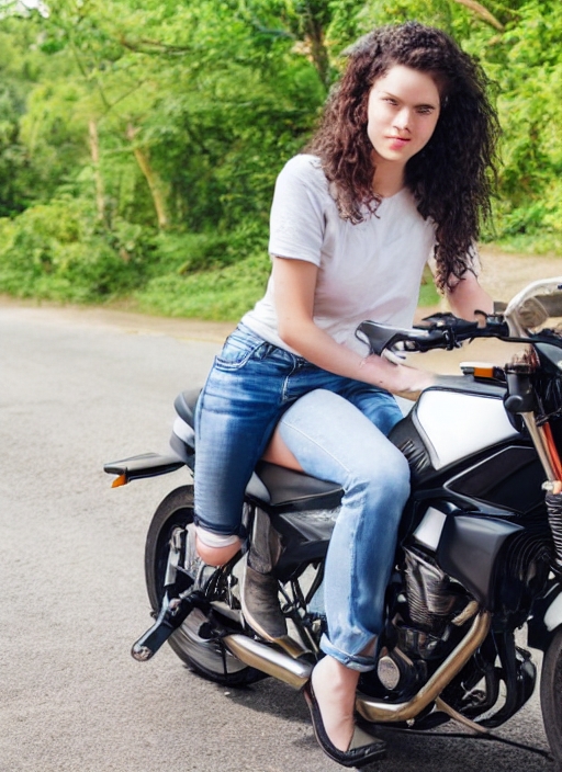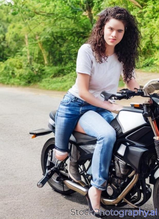 Young woman sitting on motorbike outside