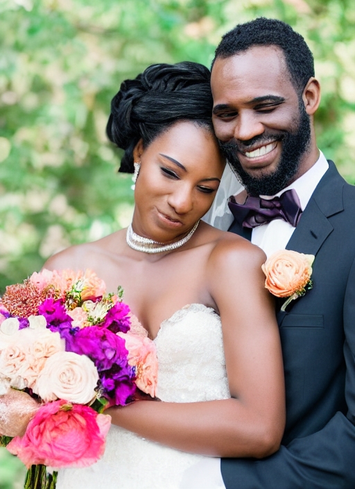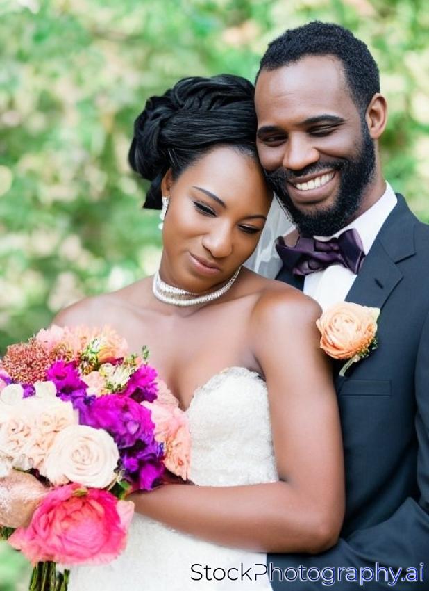 african american attractive back view beautiful black black girl black woman bride bridegroom brunette closed eyes closeness couple elegance elegant embrace fiancee flora floral flowers girl groom hug interracial couple isolated love man marriage matrimony newlyweds plants relationship studio shot suit together togetherness two people wedding wedding bouquet wedding ring white woman young adult-