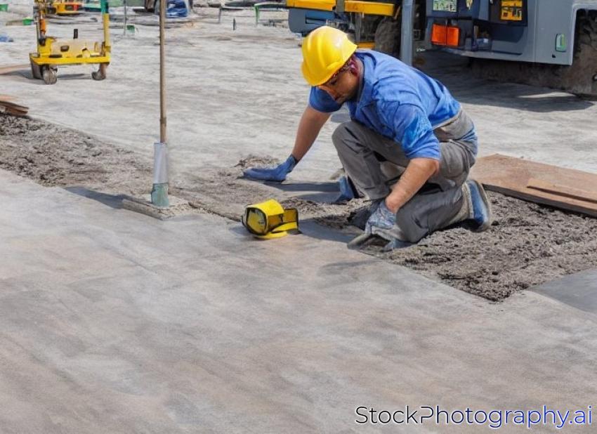 builder worker in safety protective equipment installing concrete floor slab panel at building construction site