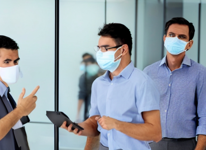 business man workers wearing face mask and clear shield having discussion through glass partition at the office as part of business in new normal during the outbreak of COVID-19 or Coronavirus