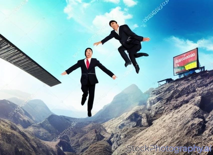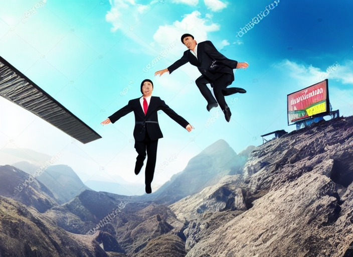 businessman jumping with empty billboard and over danger precipice on the mountain, concept for business, asian people