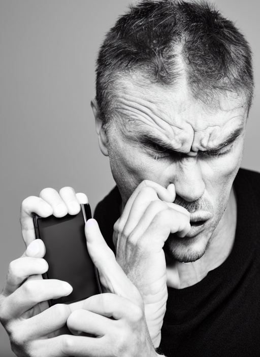 caucasian man angry with cellphone malfunction portrait isolated studio on black background