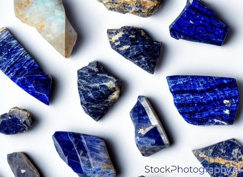 closeup of sample of natural mineral from geological collection - polished Sodalite gemstone isolated on white background