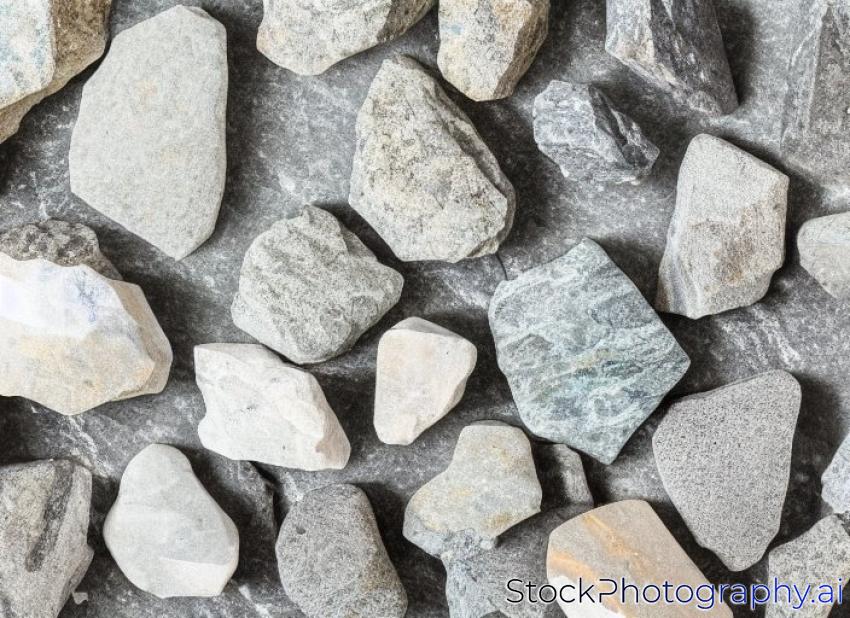 closeup of sample of natural mineral from geological collection - rough Andesite rock on white marble background