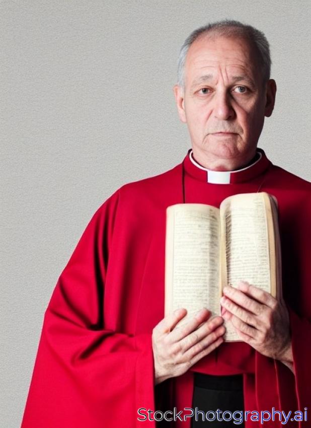 conceptual portrait of Praying priest with Holy Bible. red background