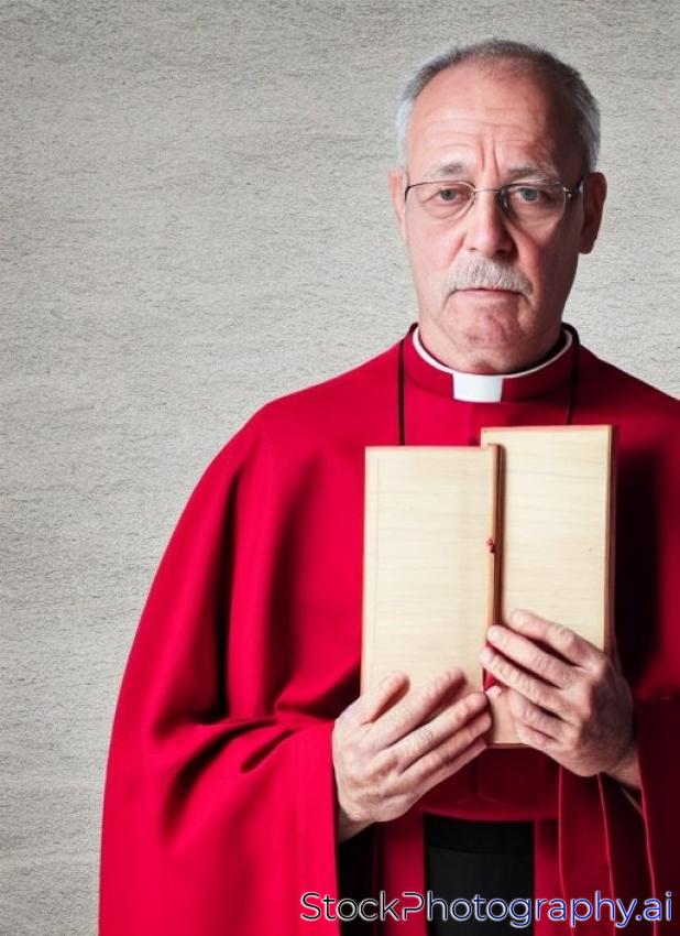 conceptual portrait of Praying priest with wooden cross reading Holy Bible. red background