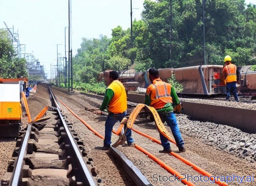 construction worker move equipment material railway on the track.team labour man bring concrete work on railroad transportation machine of infastructure in city.