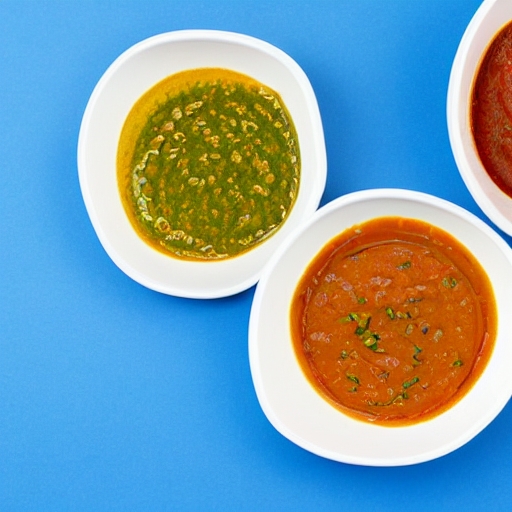 cooking sauces in white bowls on a blue mat isolated on a white background with sample text