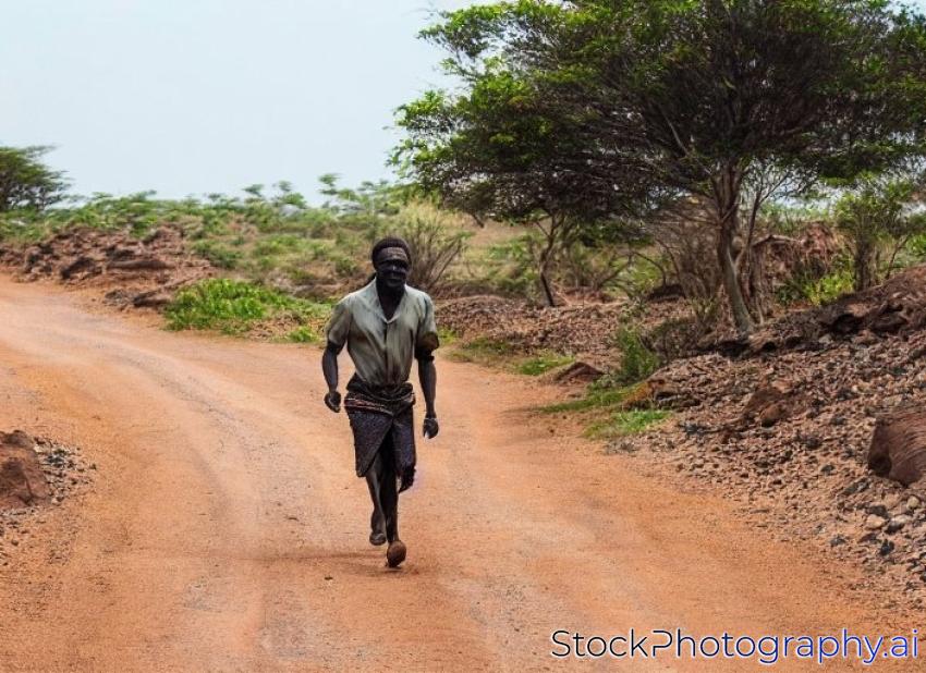 dwarfish african man strolling happily down the dirt road on a rocky coast wearing a smart-casual attire
