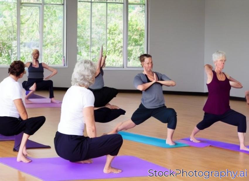 european coach showing to adult learners new yoga posture at class