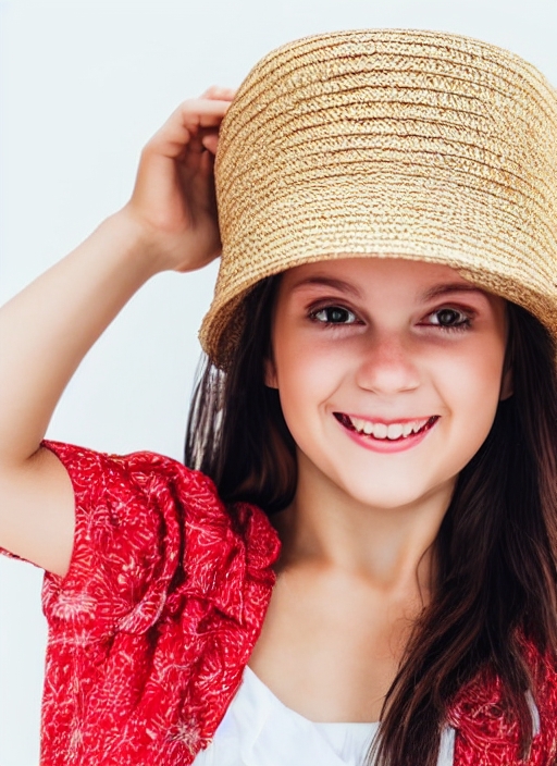 excited girl in festive clothes and Straw Hat touching chin Isolated On White