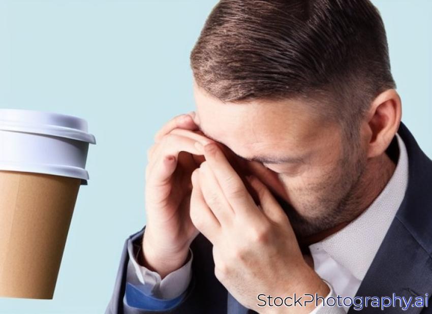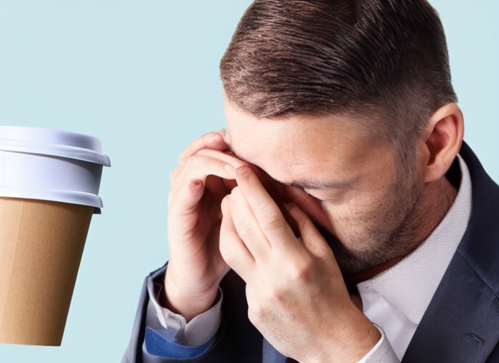exhausted businessman with sticky note on forehead taking disposable cup of coffee in box