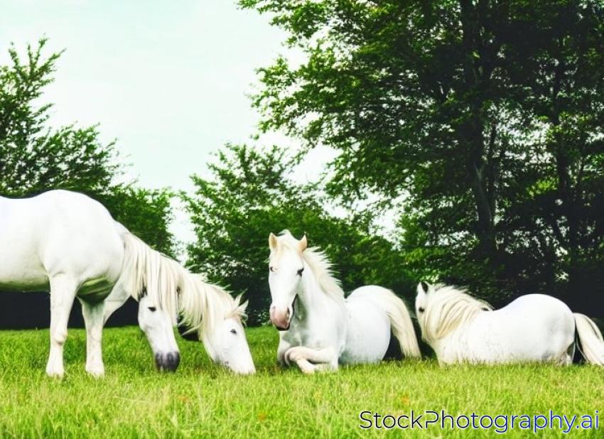 family of white horses eating in the grass in the middle of nature in a sun bet