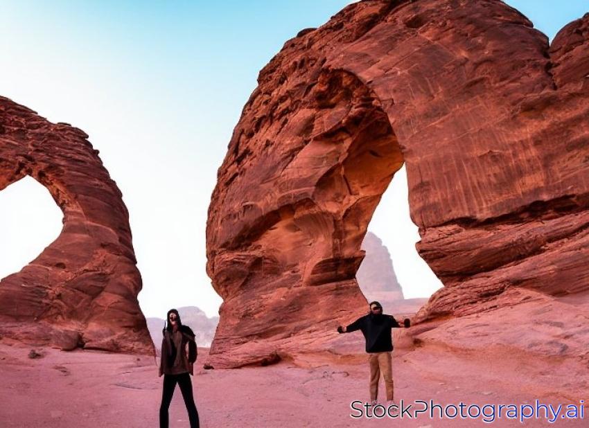 famous Um Frouth rock arch, located in the Wadi Rum desert in Jordan. Traveler photographer with open arms poses for a souvenir photo. happiness of being in a unique place in the world.