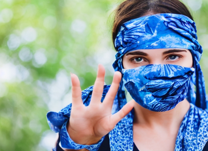 female hand with a blue bandana with hand on nature background (bunch of fives)