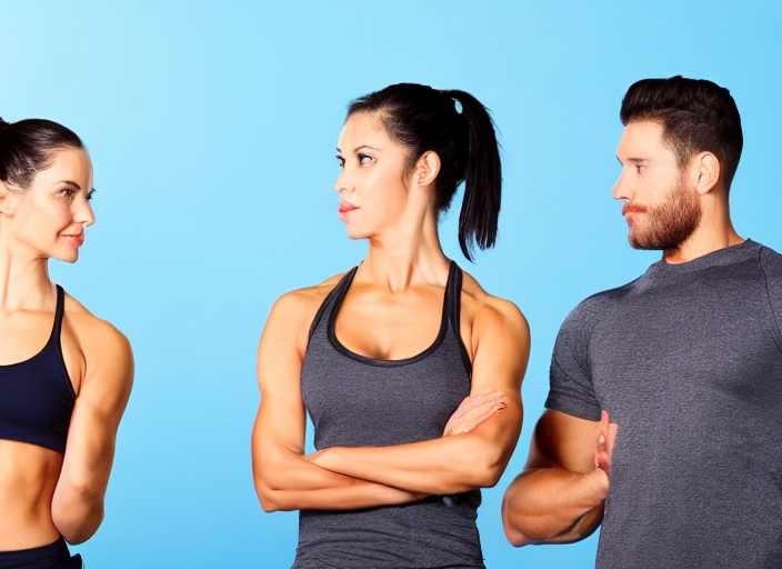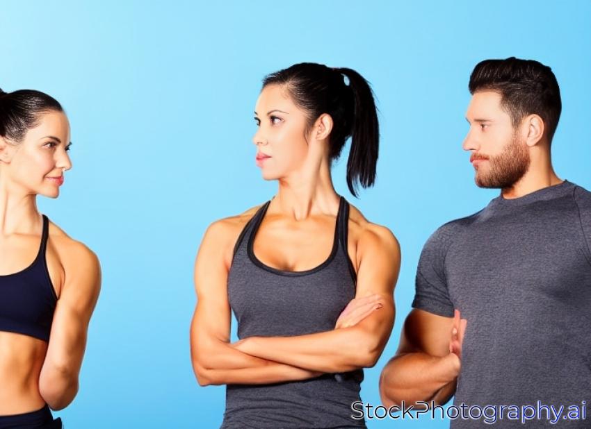 fitness man and sporty woman looking at each other isolated on studio background