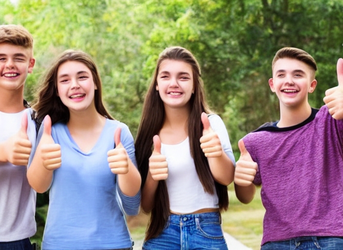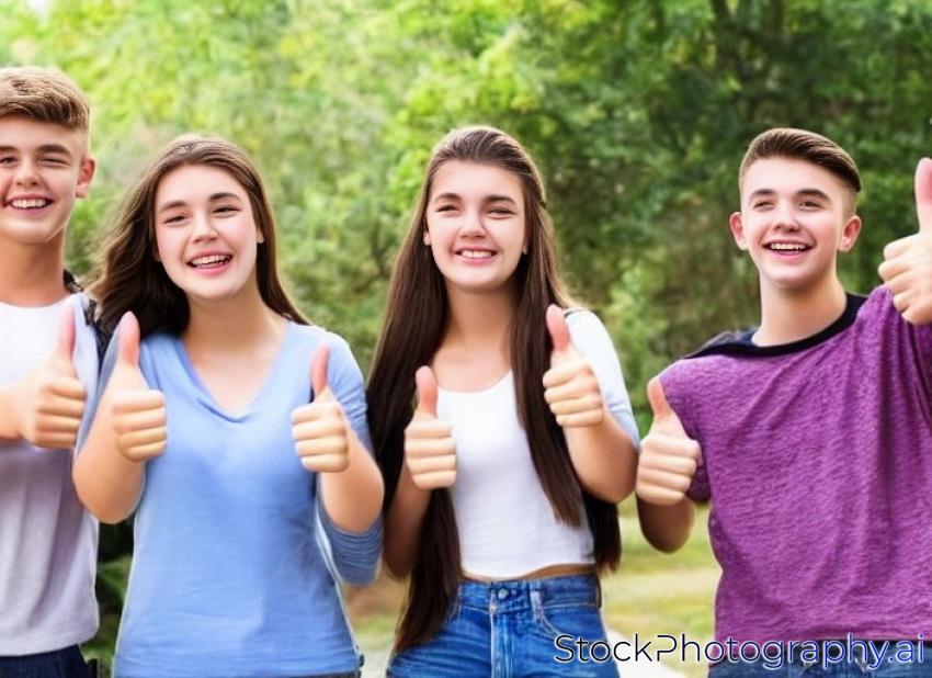 adolescents beautiful blond blond hairs brown hair brunett cheerful female friends friendship gals girlfriends girls group guy handsome happiness joy jung lachend laughing lucky male man outdoor portrait pretty puberty pupil sightly smile smiling teenager thumb up winners pose young young man youth-