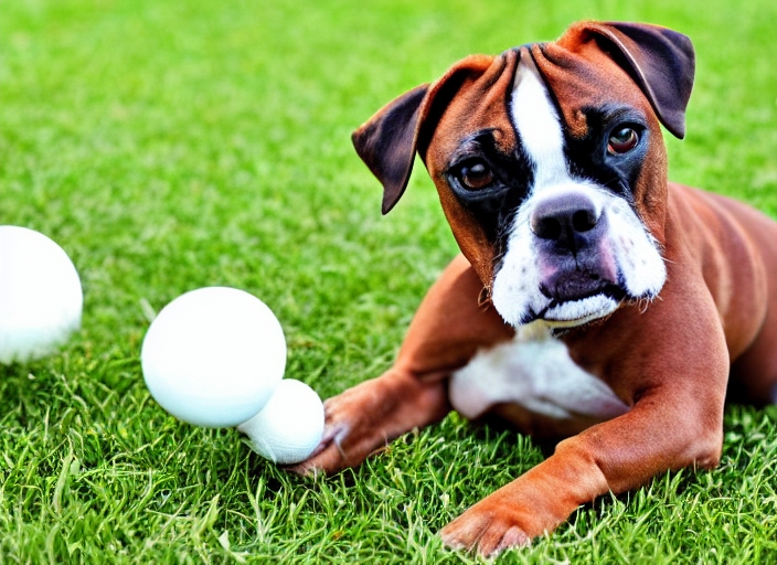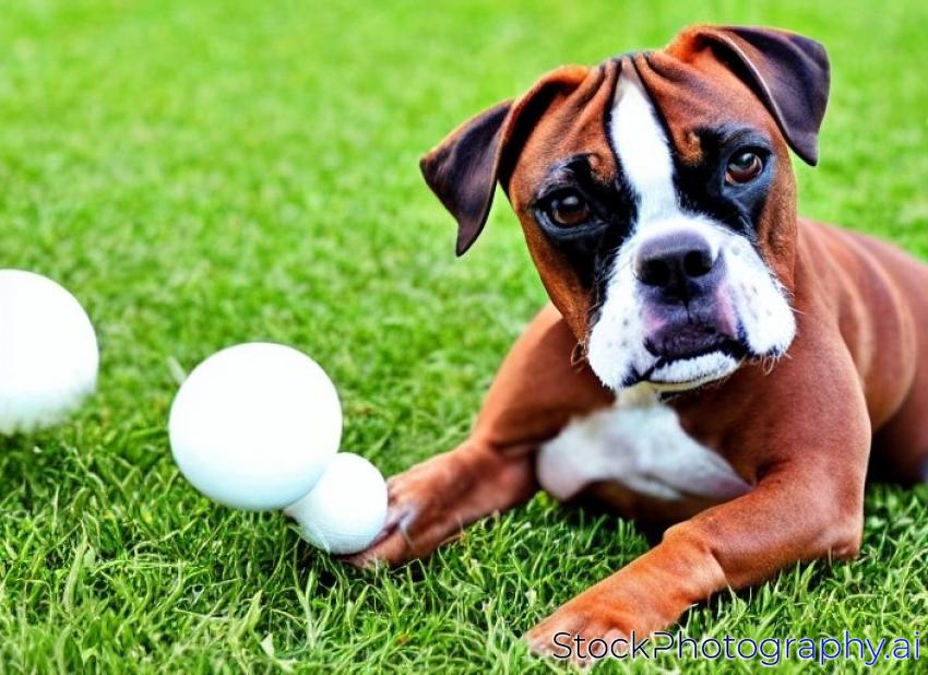funny little boxer dog playing in the grass chewing on a rubber toy