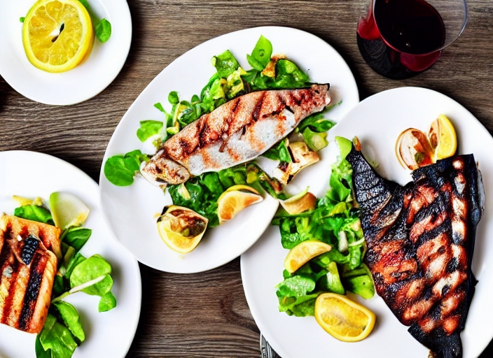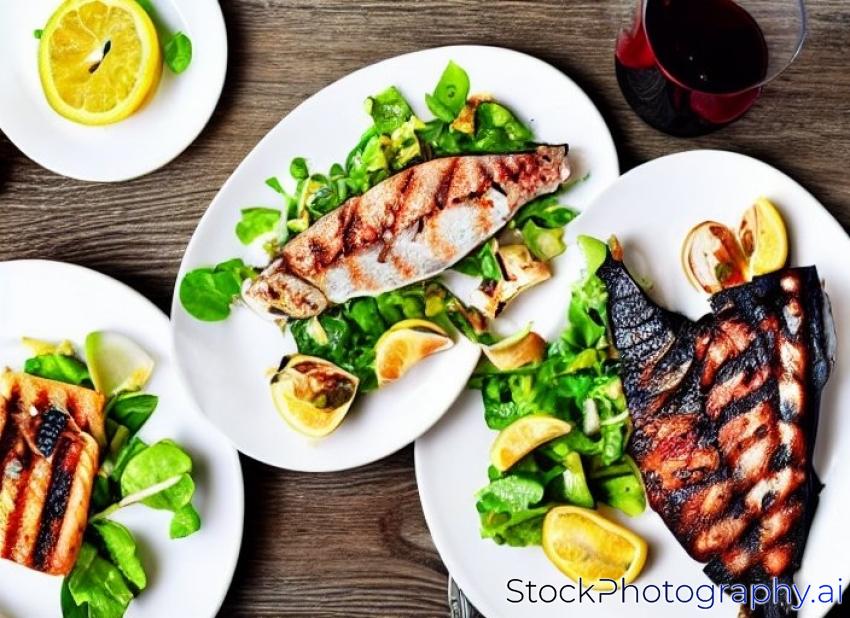 grilled fish, salad and appetizers with red wine ...