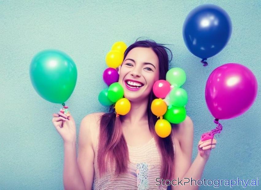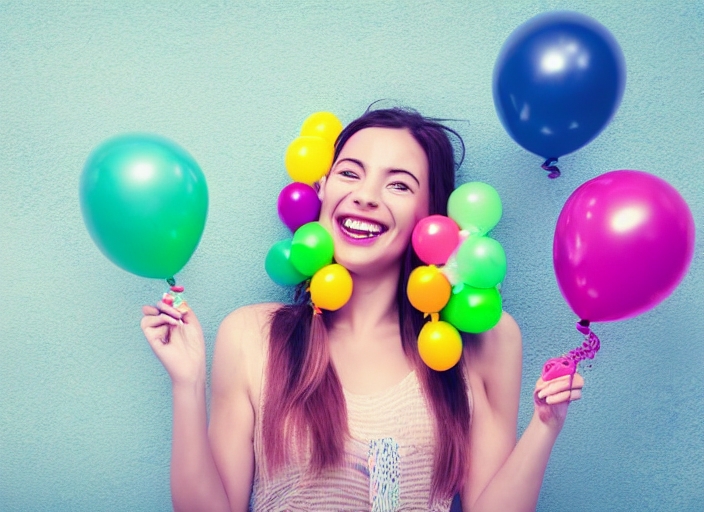 happiness concept, happy girl with multicolored balloons, joy and positive emotions