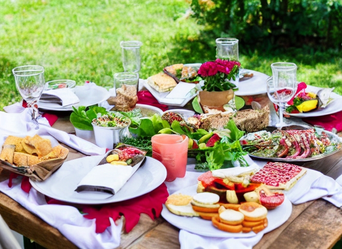 holiday summer brunch party table outdoor in a house backyard with appetizer, glass of rose wine, fresh drink and organic vegetables