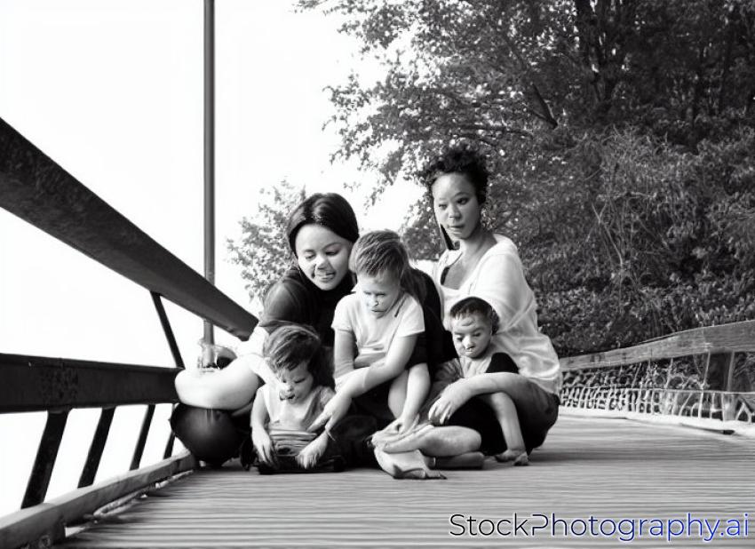 horizontal orientation of a beautiful woman sitting with her two sons outside on a bridge in black and white with copy space / Making Time for Each Other