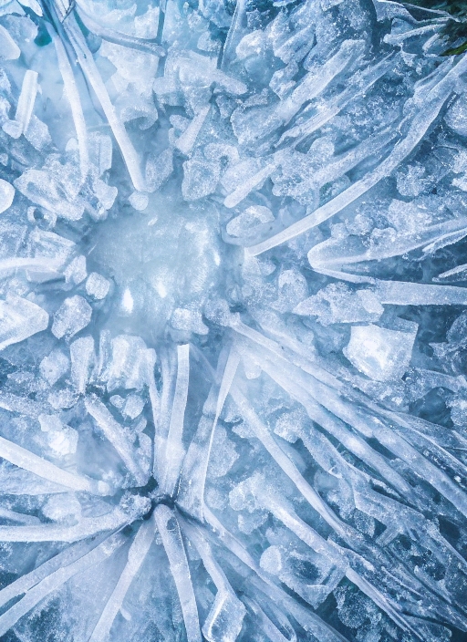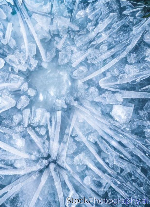 ice crystals under frozen puddle in spring forest