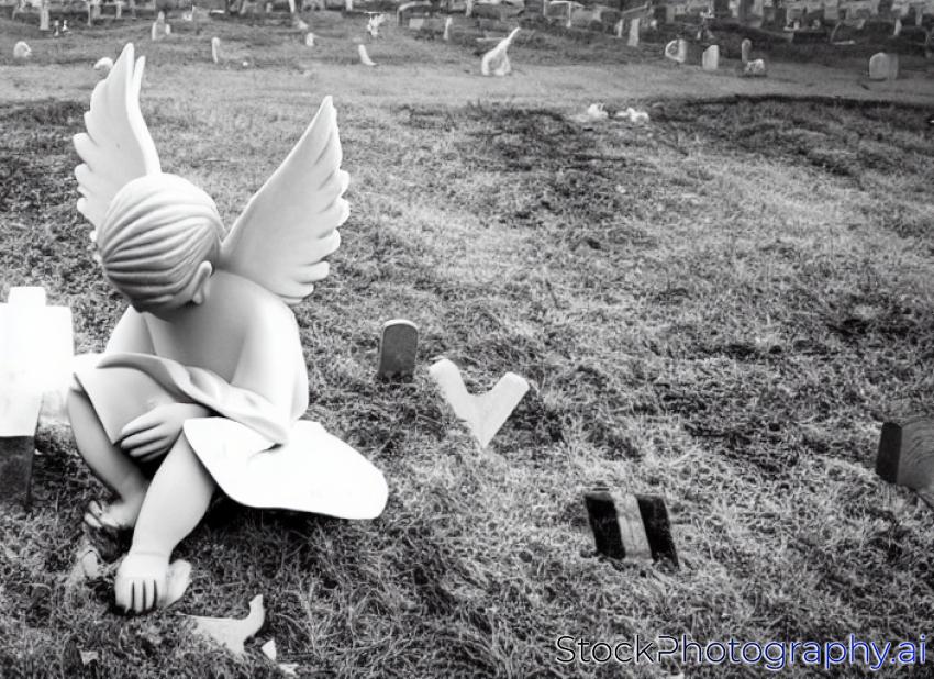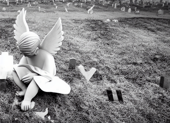 little broken angel at cemetery, black and white image