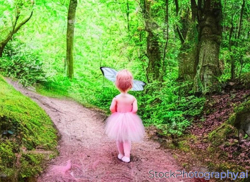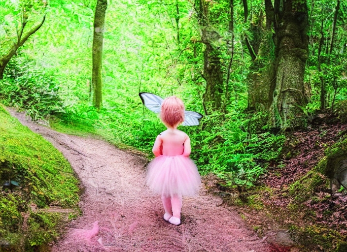 little fairy in pink fairy walk in dense green forest