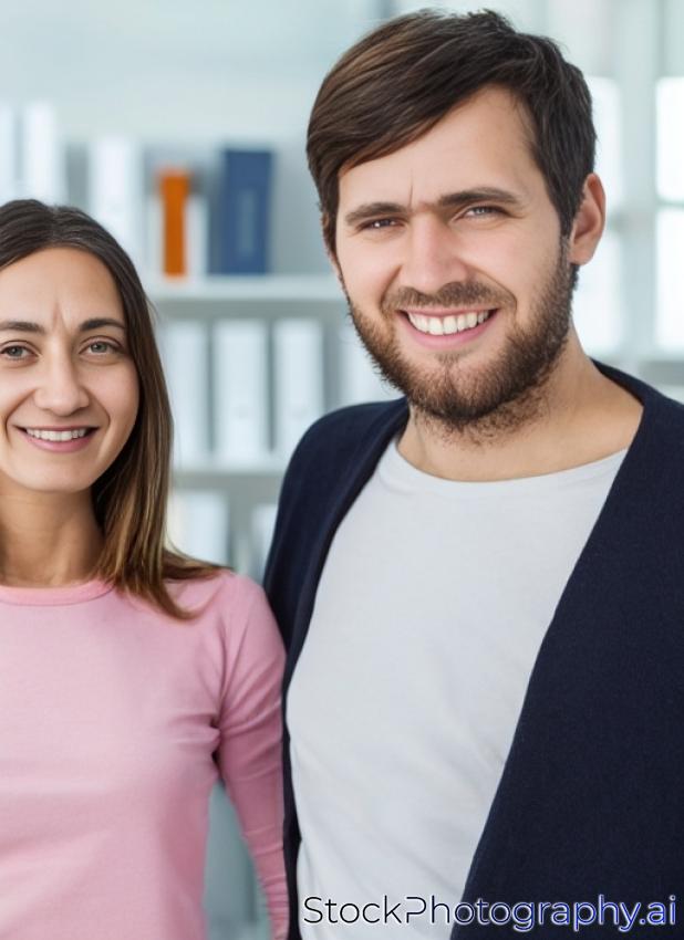 man and woman standing shoulder on shoulder in the office smiling at the camera with arms folded