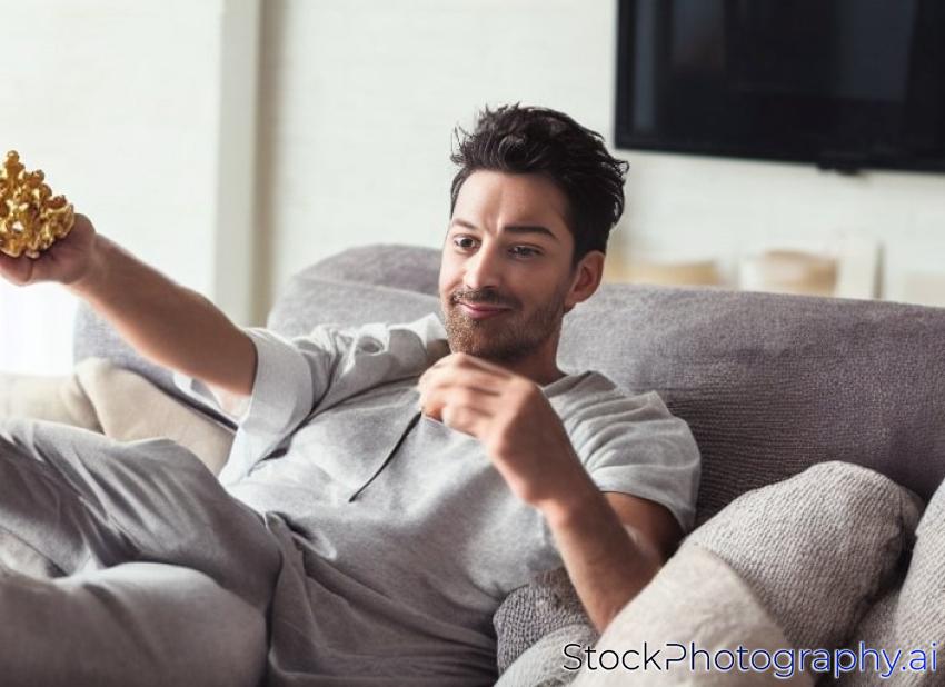 20s adult amusement bearded calm carefree caucasian causal attire comfortable earphones eating enjoying entertainment evening happiness headphones home horizontal indoor laying lazy leisure living looking at camera men mood moody music one popcorn relaxing remote control rest resting room satisfied sit back smiling snack sofa television tranquilize tv unwind watch weekend young-