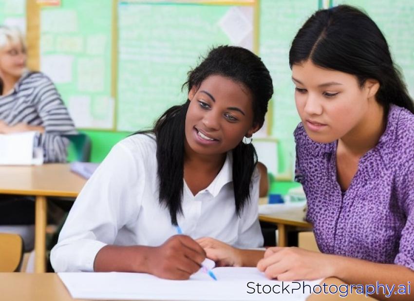mature high school teacher helping a student with her classwork