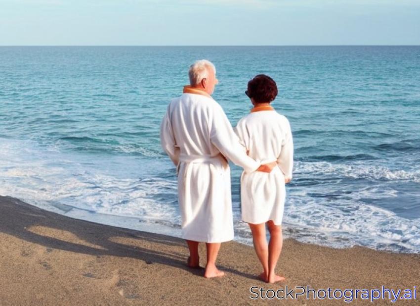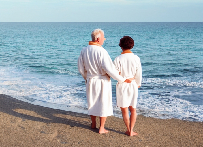 mid aged couple wearing a bathrobe near the sea