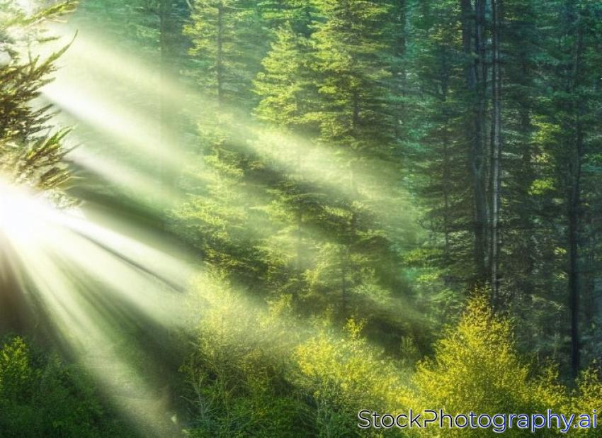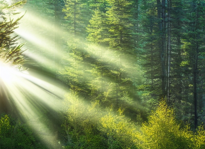 morning sunbeams in green coniferous forest