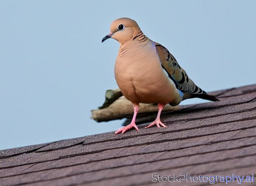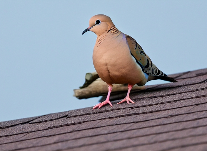 mourning dove sits on the ridge of a house's roof and observes its world; Harrisonburg, VA, USA