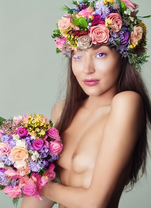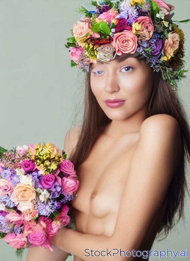 nude woman with glowing clear skin and magnificent flowers bouquet on her head