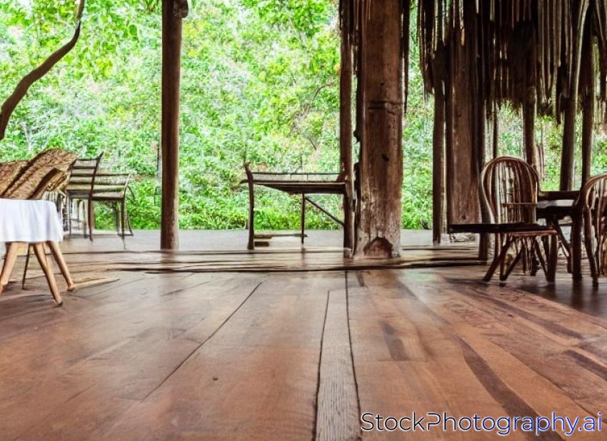 old perspective wooden floor with blur image of table set and banyan tree